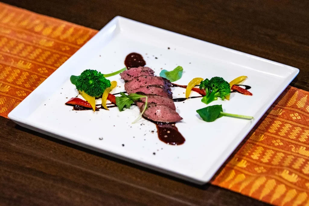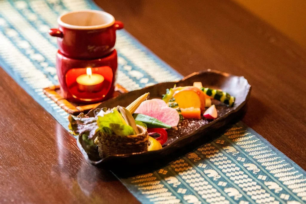 無国籍料理(刺身・豚の角煮・ピザ・パスタ・チーズフォンデュ・etc)ワイン・焼酎など数多く取り揃えた、お洒落なリゾートダイニングです。簾を垂らせば半個室になるソファー席は大人気。是非ご予約下さい。
